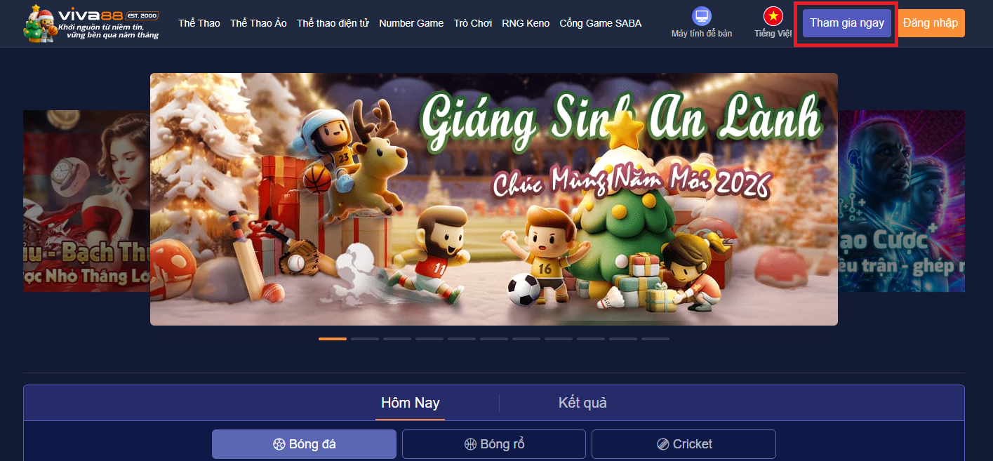 Bước 2: Chọn vào muc “Tham gia ngay” ở góc phải màn hình nhà cái cá cược.